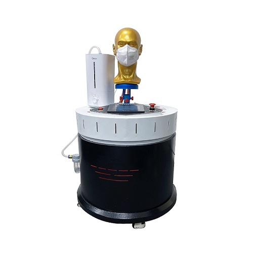 模拟穿戴预处理机,由呼吸模拟器、试验头模、饱和水蒸气发生装置、温度控制装置、 流量计等组成,可控制呼吸模拟器以25次/分钟,每次2L的呼吸量运行。可控制头模嘴巴附近饱和水蒸气的温度为(37+2) °。开启预处理装置,使呼吸装置及饱和水蒸气发生装置进入工作状态,直到达到稳定。将呼气器以气密的方式佩戴在匹配的试验头模上,测试20分钟左右。从呼吸器上取下颗粒物过滤材料,然后重新安装上去,继续重复测试10次。